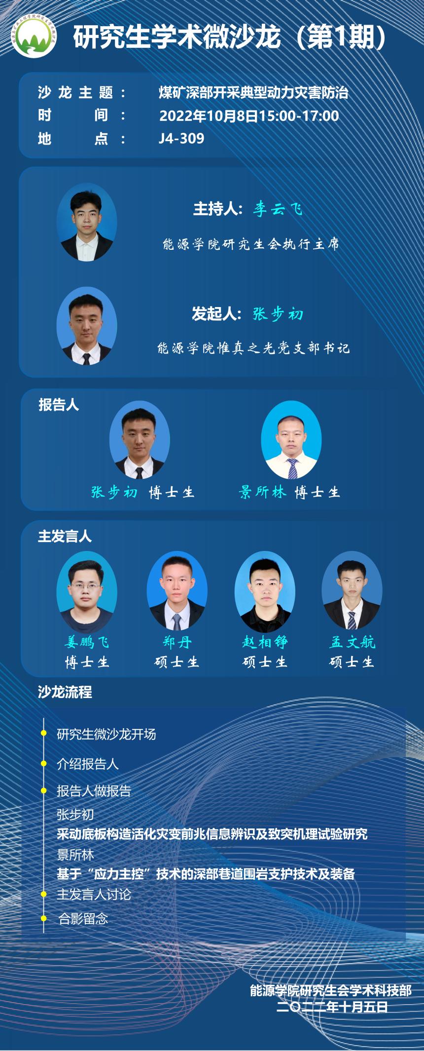 10月8日,由成人电影 主办,能源与矿业工程学院研究生会承办的第1期研究生学术微沙龙“煤矿深部开采典型动力灾害防治”在J4-309成功举办。本次学术微沙龙活动邀请惟真之光党支部书记张步初、博士生景所林做主题报告,学院研究相关方向的博士生和硕士生参加,活动由研究生会执行主席李云飞主持。