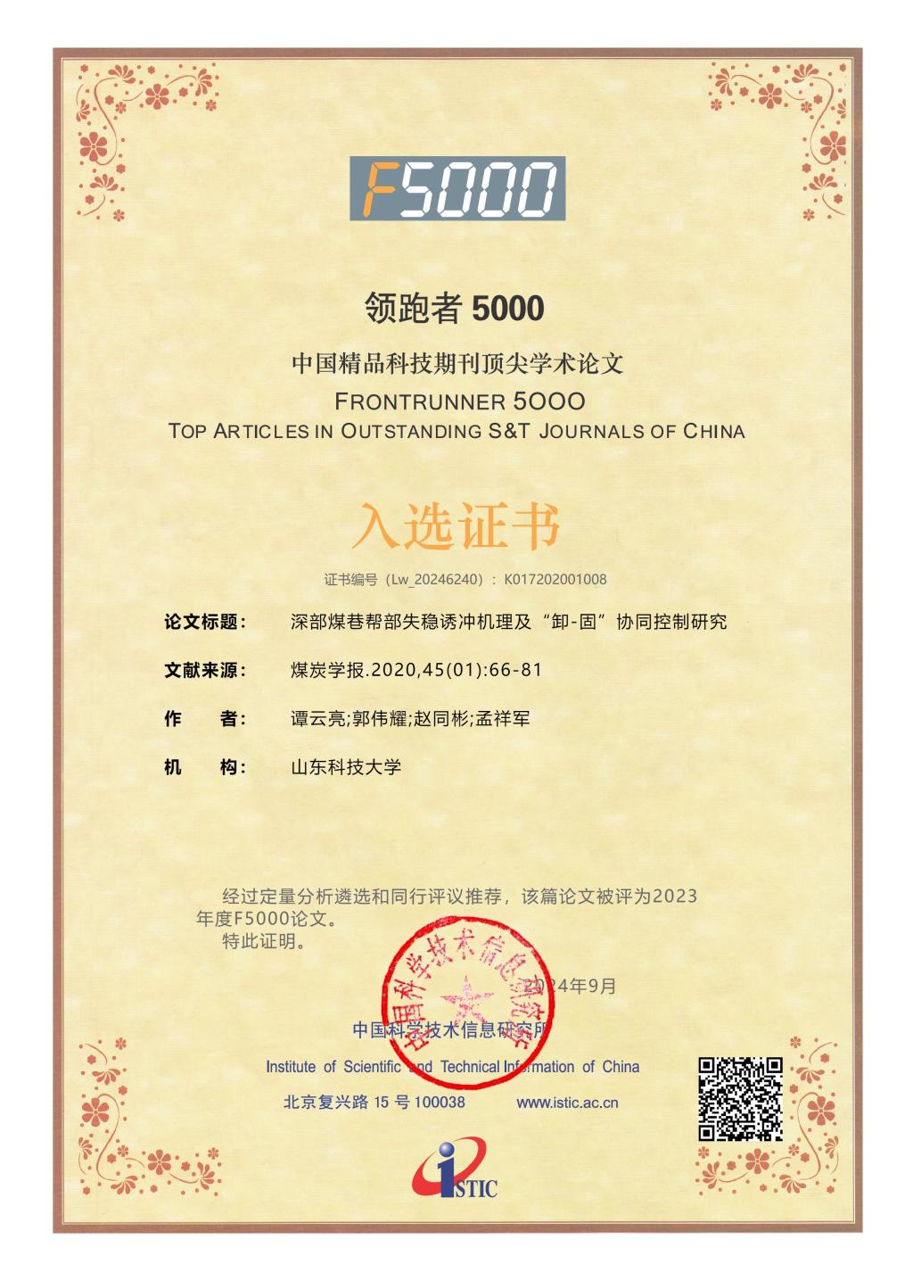 近日,科技部中国科学技术信息研究所发布了2023年度“领跑者5000—中国精品科技期刊顶尖学术论文(F5000)”入选论文名单。成人电影 谭云亮教授等在《煤炭学报》发表的“煤矿深部开采冲击地压监测解危关键技术研究”“深部煤巷帮部失稳诱冲机理及‘卸-固’协同控制研究”两篇论文,入选2023年度(2024年公布)F5000论文。