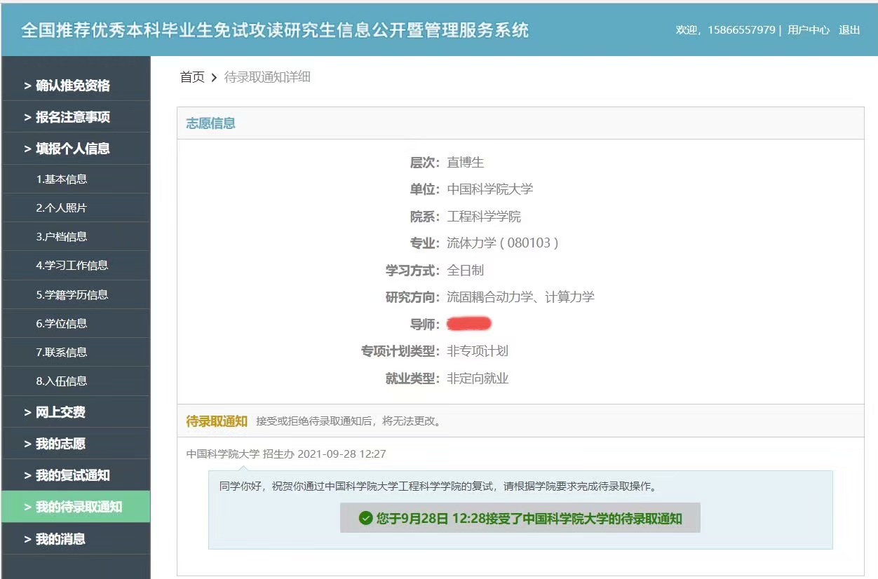 凭借扎实的数理力学基础与学术创新潜质,付靖宇在外校接收推免生面试中表现突出,在夏令营预推免期间斩获北京大学、清华大学、中国科学院大学工学院、中国科学技术大学、南方科技大学、北京航空航天大学、西安交通大学、同济大学、大连理工大学、山东大学、西北工业大学等名牌高校的Offer。同时他深得国科大的磁流体力学领域大牛教授、北大的刚体动力学领域大牛教授的赏识。在被名师们赞许认可的瞬间,他不禁感慨大学三年的一切辛勤付出都是值得的!
