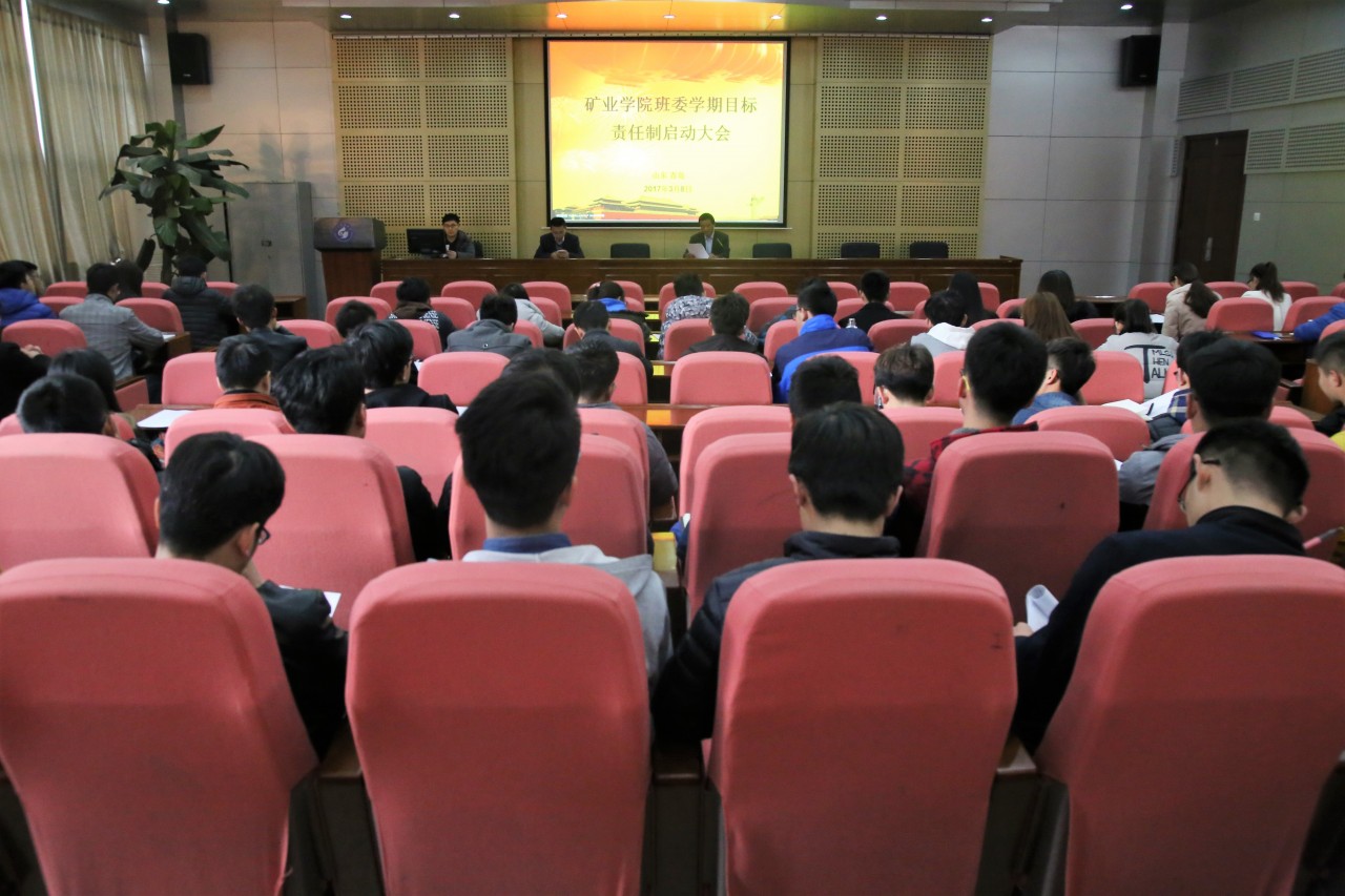 近日,为更好发挥班委的责任意识,落实“班委目标责任制”工作,矿业学院团委在101报告厅召开“班委目标责任制”启动大会。党委副书记兼副院长穆玉兵,团委书记马鹤,团委兼职辅导员王学武出席会议,会议由马鹤主持,所有班级班委参加会议。