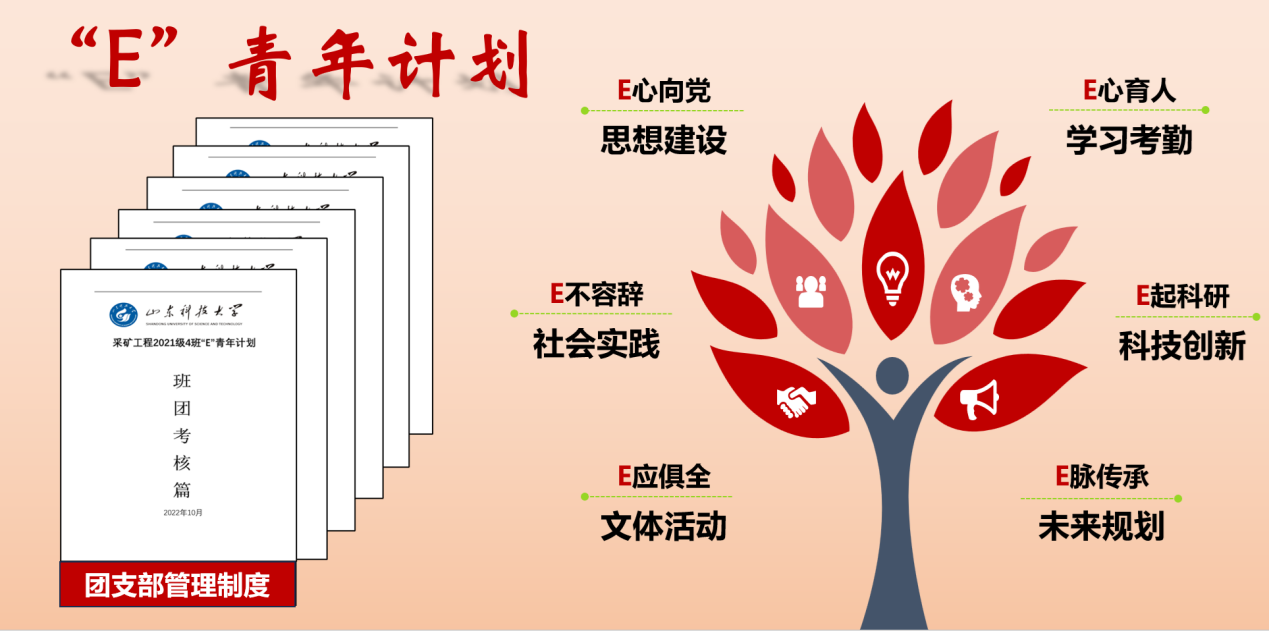 本案例描述了能源与矿业工程学院采矿工程2021级4班团支部特色品牌建设背景,过程以及相关成果。为响应团中央号召, 采矿工程2021级4班团支部在团委的积极引领下,以品牌特色活动引领提高支部成员学习与科技创新能力,致力打造思想引领、学习考核、科技创新、文体活动、社会实践多元一体的“E”青年团支部。