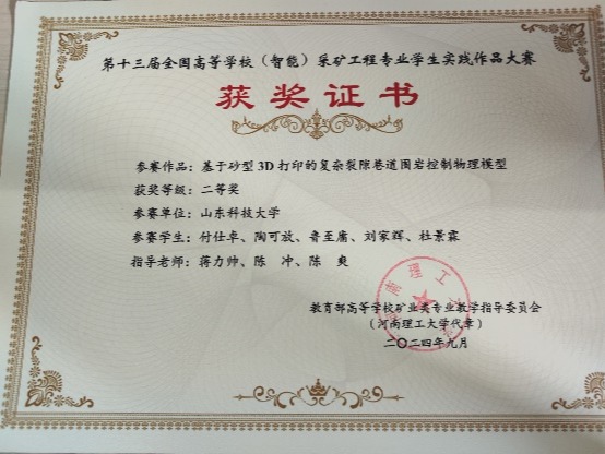团支部明确科技创新的目标,提升成员的创新意识和创新能力,推动采矿工程技术的创新与发展。通过科技创新活动,培养成员的创新思维和实践能力,为未来的职业发展打下坚实的基础。支部通过选拔具有科技创新潜力和兴趣的同学,组建了班级科技创新小组。小组内部实行分工合作,每个成员都承担着不同的角色和任务,共同推进项目的进展。同时,班级还定期举办科技创新团队培训活动,提升同学们的专业技能和团队协作能力。在班主任和任课老师的指导下,班级科技创新小组逐渐成长为一支具备较强创新能力和实践能力的优秀团队。班级成员获挑战杯省级二等奖及校级二等奖、中国好创意暨全国数字艺术设计大赛省二等奖两次、中国好创意暨全国数字艺术设计大赛省三等奖、全国高等学校采矿工程实践作品大赛二等奖及三等奖等奖项,共计国家级奖项8项、省部级奖项40多项。