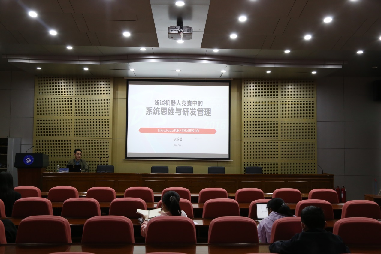 李政岳从机器人概述、机器人研发过程、机器人方案竞品分析和机器人设计技巧等方面进行讲解。他从个人参赛经历出发,向同学们分享了团队参赛技巧。他建议同学们找准自身定位、实现团队协作以推动团队进度,在团队中创造价值。此外,李政岳为同学们讲解了常用的 solid works 、 up studio 等软件的基础操作,指出比赛中所需要注意的事项,针对往年比赛存在的问题为同学们进行了详细的解答。