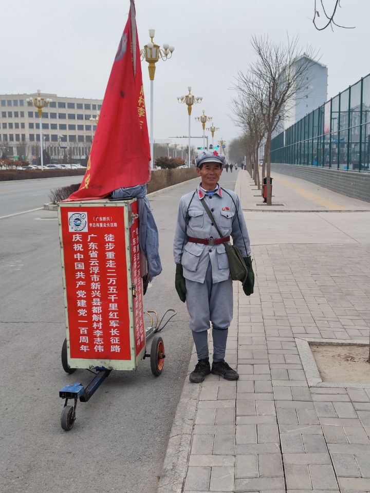 因种种原因,他重走长征路的梦想一直没能实现。现儿女已成家,今年又是中国共产党成立100周年,老人家坚定了决心,为达成心愿稍作准备后就立刻行动起来。带着毕生的梦想,李志伟老人于2021年4月15日在中国工农红军长征第一站——江西省赣州市瑞金出发,推着50多公斤重的自制手推车(干粮、四双解放鞋、五面红旗、一部手机,一顶帐篷、两套红军服、一个军用水壶等随身物品就是全部行囊)已徒步经过江西、福建、广东、湖南、广西、贵州,甘肃,于2022年1月21日到达宁夏彭阳县,历时9个多月。