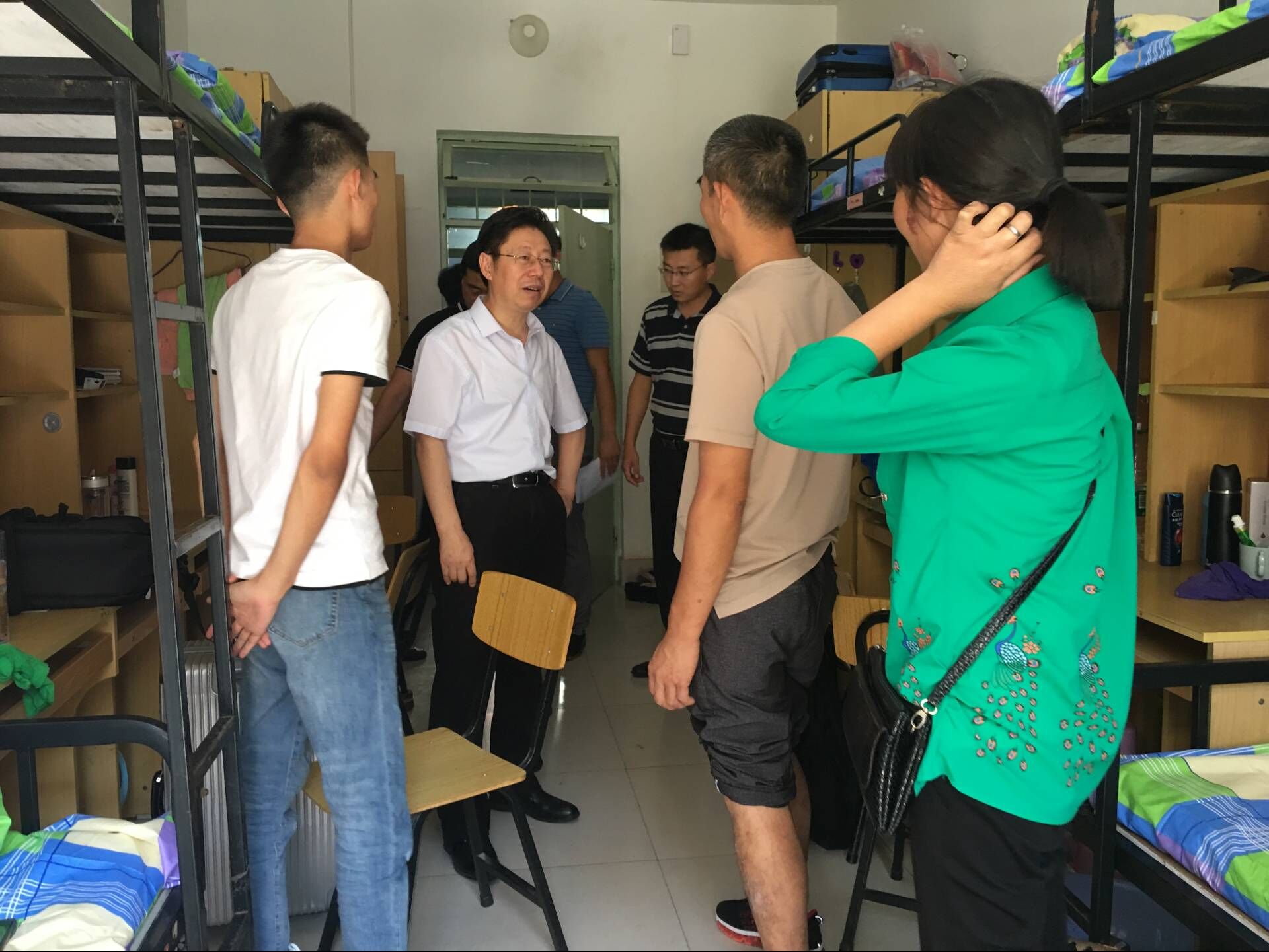 9月8日,成人电影 2018级新生报到工作正如火如荼开展。上午,矿业学院院长谭云亮、党委副书记兼副院长穆玉兵、团委书记马鹤、辅导员宗彩建一行专程来到学生宿舍看望新生与家长。