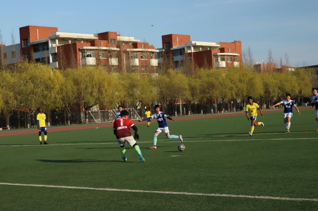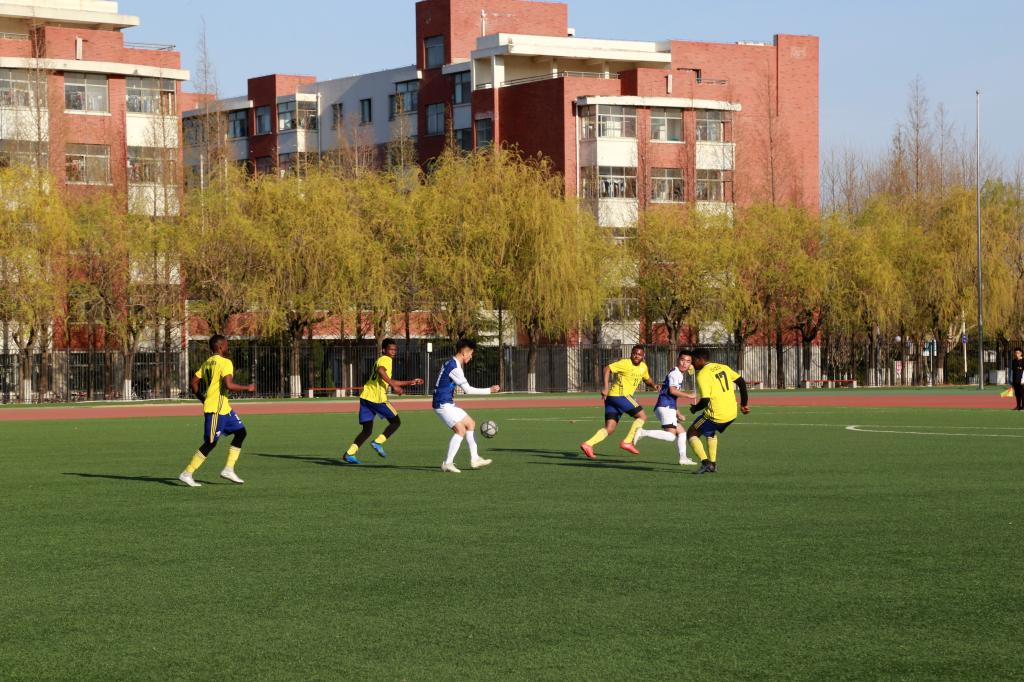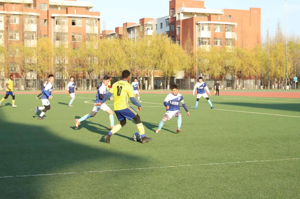 比赛开始前,双方队员进行热身运动,相互击掌问好,以示友好。随着裁判一声哨响,两支球队展开了激烈地角逐。上半场比赛中,国交队员略占优势,我方队员不甘示弱,严守球门,经过近50分钟的激烈角逐,最终以0:0结束上半场比赛。