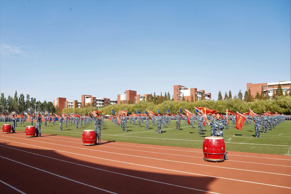 彩旗方队表演是矿业学院在军训汇演仪式上的另一大亮点。各学院军训方队表演结束后,踏着铿锵有力的《精忠报国》节奏,188名身着迷彩、举着连旗的新生和4名鼓手集聚在操场中央,挺立如松。在教官的统一指挥下,他们随着音乐舞动手中的旗帜,像一团飞动而热情的火苗,摆出各种造型,口号声响彻云霄,引发现场观众的雷动掌声,更展示出矿院学子的青春活力!