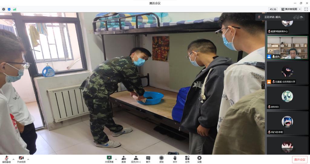 2019级退役学生李春尧、王家亮、刘兆阳深入新生宿舍讲解内务标准,将C2-134宿舍打造为内务标杆宿舍,通过线上会议进行内务示范,让全体同学对宿舍内务有了新的认识,新生们纷纷尝试将被子叠成“豆腐块”。李春尧与新生们分享了自己应征入伍的经历和感触,将应征入伍的政策进行了简要解读。辅导员曹斌线上安排部署了新生入学教育工作,对新生学习提出了高要求,督促新生端正学习态度,同时结合《学生手册》《能源与矿业工程学院内务检查标准》对新生的内务整理和日常生活做出要求,对宿舍日常行为、宿舍内务和作息时间进行了规范,加强新生的安全规范意识,培养新生养成良好的生活习惯。