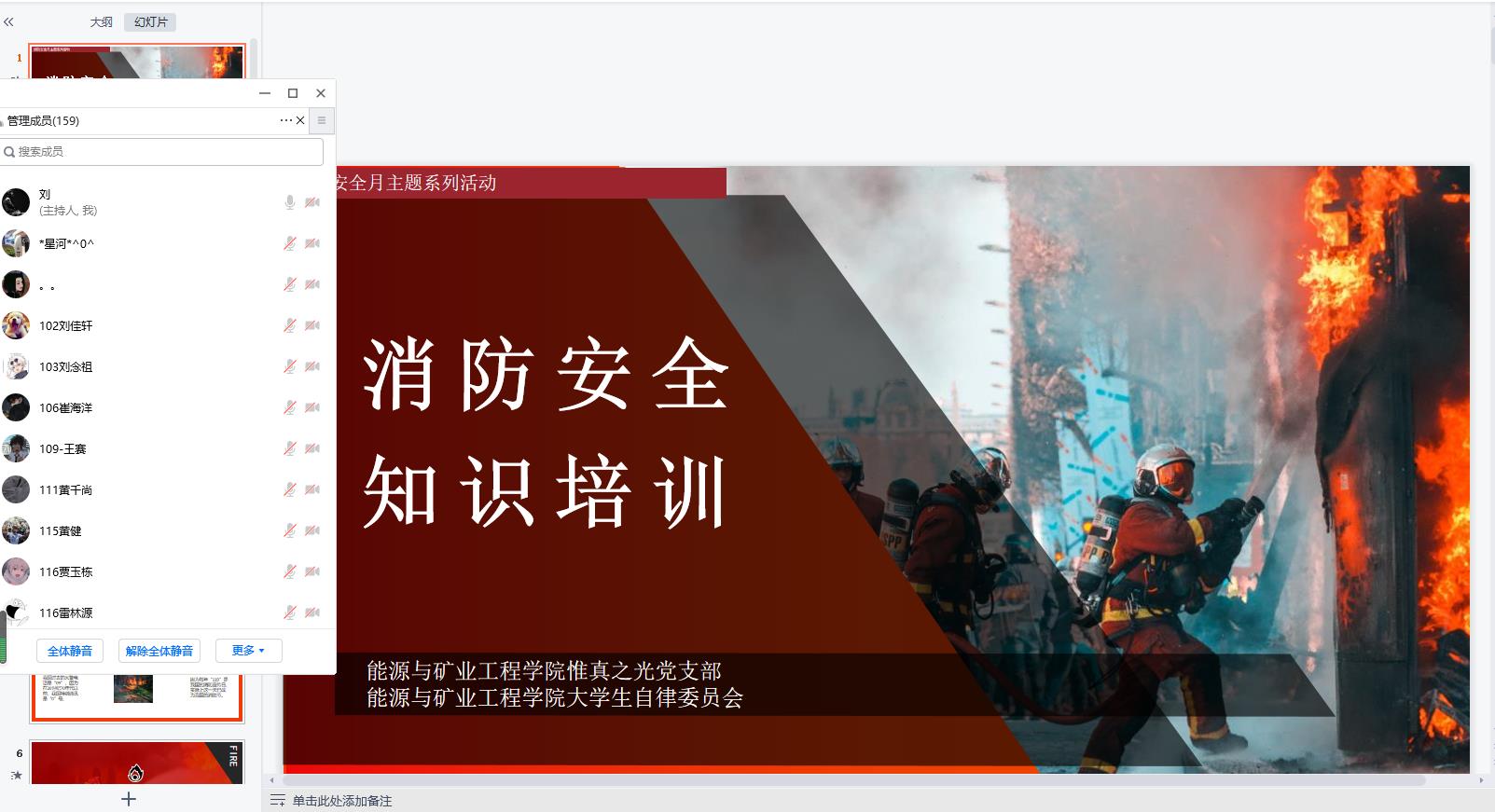为进一步加强学院消防安全教育,筑牢校园消防安全“防火墙”,11月9日,成人电影 举办线上消防安全教育讲座活动,辅导员刘雨池主讲,2022级全体同学参加。