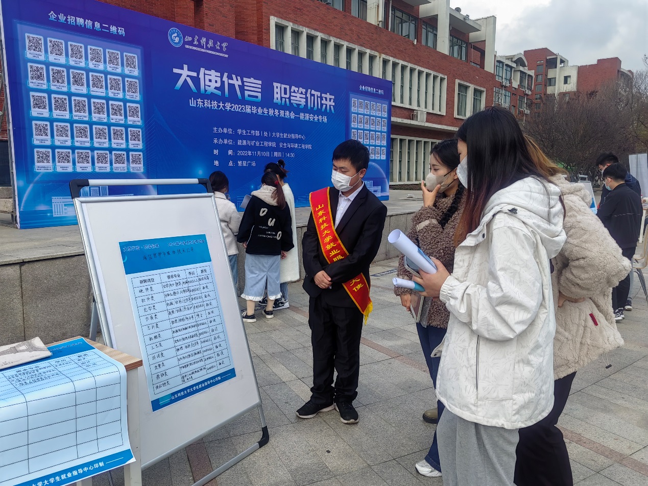 11月10日下午,学生工作部(处)大学生就业指导中心主办,成人电影 与安全学院共同承办的“大使代言,职等你来”秋冬双选会会在繁星广场顺利举办。山东黄金集团、山东能源集团等30家用人单位通过“校园就业大使”参会,提供就业岗位600余个。招聘专业涉及采矿、安全、测绘、地质类等专业,涵盖本科和研究生各学历层次。