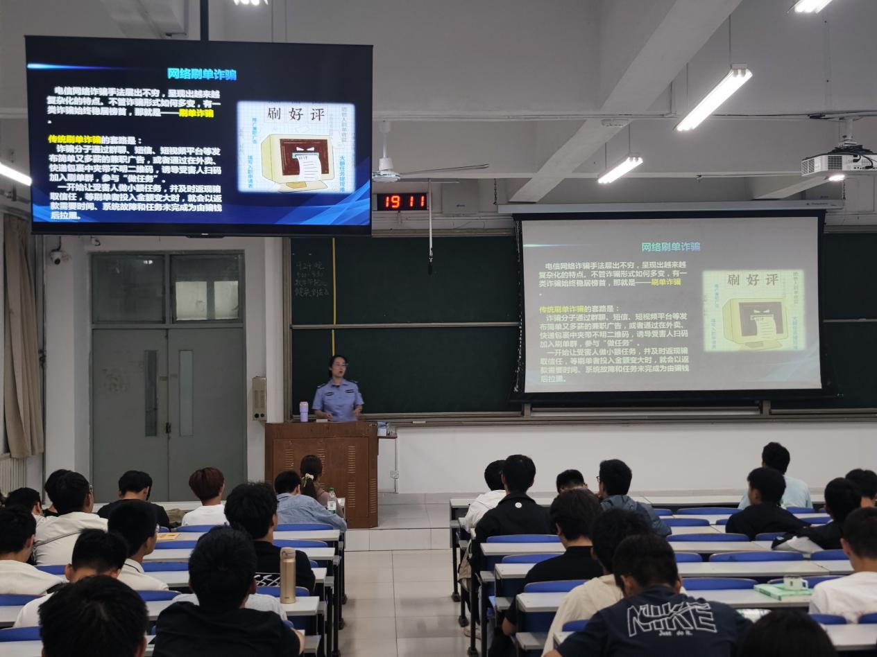 刘爱芳结合其丰富的基层警务工作经验,立足大学校园实际,为同学们进行了一场“火力全开”的硬核科普。他从专业角度深入剖析了当前高发的电信网络诈骗类型,重点解析了“刷单返利”“冒充客服”“虚假购物”“网络游戏产品交易”以及“冒充熟人(老师、同学)”等针对大学生群体量身定做的诈骗套路。刘警长通过展示辖区内发生的真实案例,以案说法,深刻揭示了诈骗分子的作案手法与心理操控技巧,让同学们直观感受到诈骗就在身边,危险不容小觑。