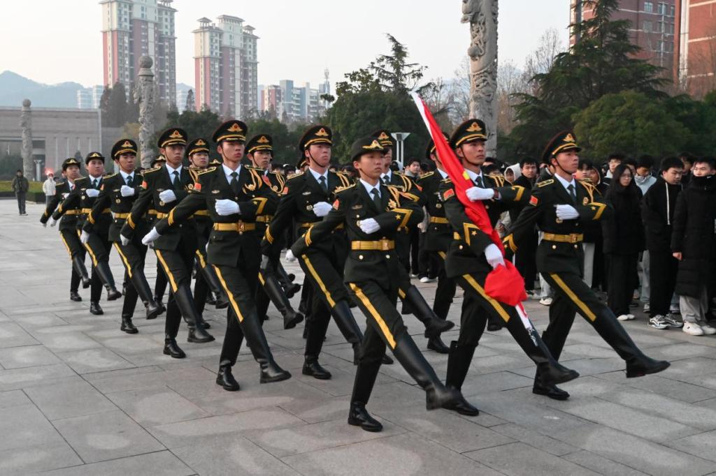 国旗护卫队队员身着笔挺的制服,迈着铿锵有力的正步,将国旗护送至升旗台。在嘹亮激昂的国歌声中,鲜艳的五星红旗冉冉升起,全体师生行注目礼,现场气氛庄严肃穆。