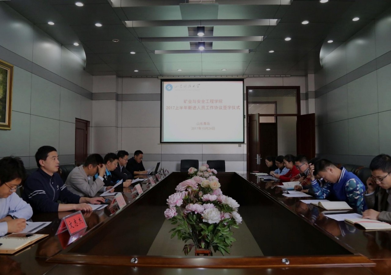 10月24日,矿业学院在学院楼321会议室举行2017上半年新进人员工作协议签字仪式。院党委书记梁赛江、院长谭云亮、党委副书记兼副院长穆玉兵、重点实验室副主任陈连军、院长助理朱祝武等学院领导班子成员出席,2017年上半年新引进的八名博士参加。仪式由梁赛江主持。