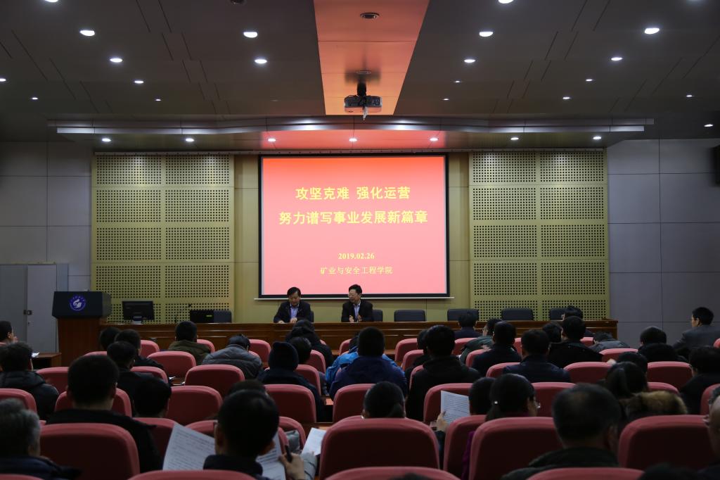 2月26日下午,矿业学院在J4-101报告厅召开全体教职工大会。学院党政领导班子成员,全体教职工参会。会议由学院党委书记董桂刚主持。