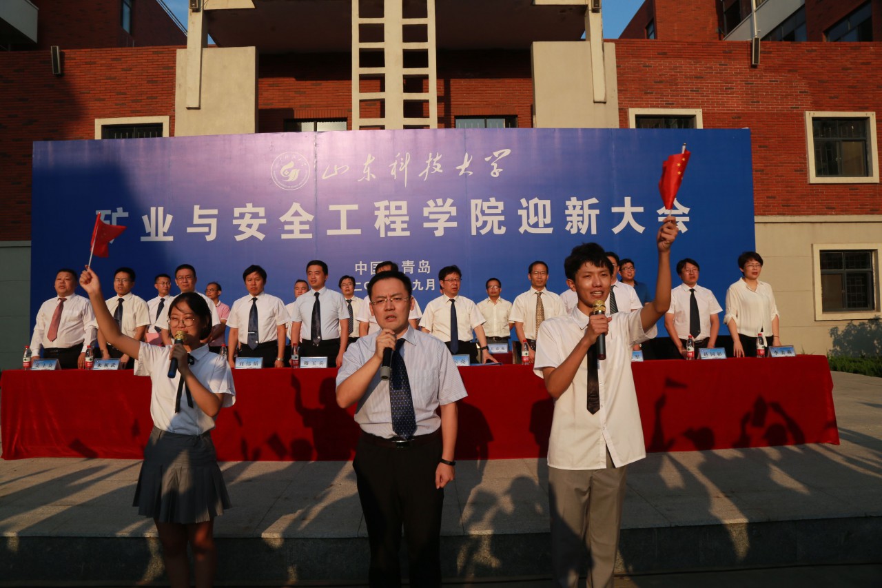 2019 级新生代表付澔天代表新生向学院老师、迎新工作人员表示感谢,他带领2019级全体新生集体宣誓:“高举社会主义伟大旗帜,秉承‘惟真求新,自强不息’院训精神;爱国励志,坚定信念;遵纪守法,诚实守信;勤学笃信,自强不息……”字字铿锵,句句有力,彰显出矿院学子勇于拼搏、敢于进取的决心和信心。