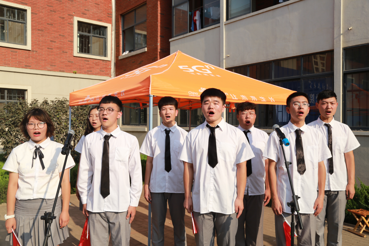 大会开始前,青年教师代表蒋力帅和学院大学生艺术团现场教唱《我和我的祖国》以及《成人电影 校歌》,对全体新生进行爱国爱校教育,献礼中华人民共和国成立七十周年。旋律响起,全体同学起立,满怀激情挥舞着国旗齐声放歌,用最美的歌声向祖国致敬,用最真挚的情感为科大颂歌。在激昂的歌声中,2019级新生们接受了开学第一课的洗礼,知时明势、放飞梦想,他们将在这里迈上人生新征程。