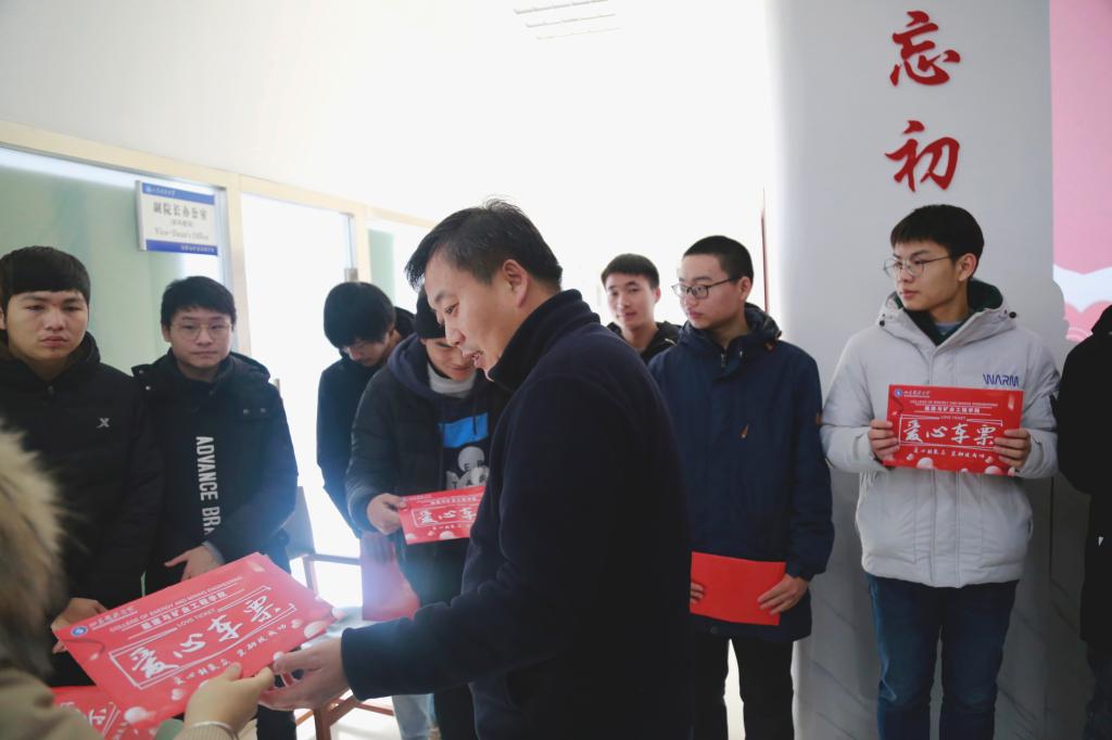 董桂刚为在场同学发放“爱心车票”,他表示,学院领导老师自发为同学们准备的“爱心车票”,是为了激励大家努力学习,拼搏成长。他对同学们提出了三点希望:一是要相信困难是暂时的,应时刻保持希望和信心,理性看待同学间的贫富差距,不盲目攀比,敢于面对现实,以此历练自己,增强责任意识;二是自立自强,拿出作为成年人应有的担当,切勿怨天尤人,应拥有积极向上的心态,架好人生的舵;三是常怀感恩之心,以成绩回报社会,避免自尊心过强,应加强与老师的交流,共同解决问题。