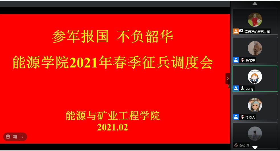 2月8日晚,成人电影 利用腾讯会议平台举办“参军报国,不负韶华”春季征兵推进会。辅导员老师宗彩建、退役大学生代表和志愿应征入伍同学参加会议。