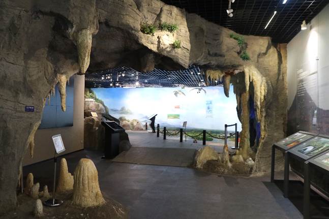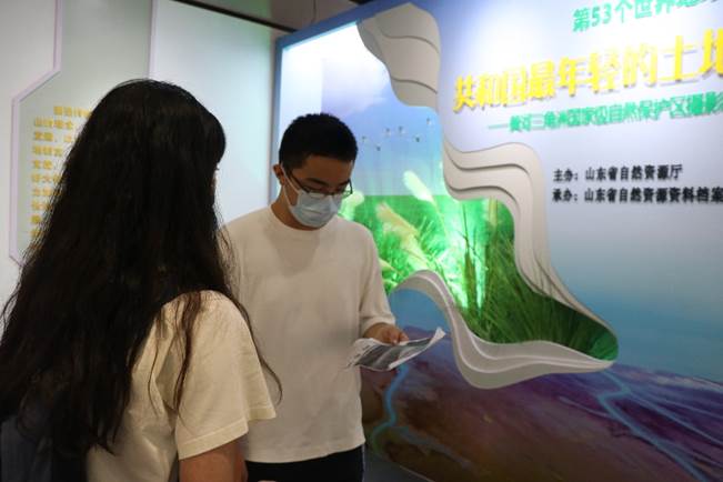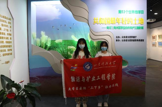 走进博物馆展厅,映入队员们眼帘的是各种矿物、岩石及宝石,地质现象,地层、古生物化石标本,各种矿物、岩石,并有典型矿床实例,之后,队员们来到黄河三角洲国家自然保护区摄影展厅,在这里,黄河的美丽的地貌被刻画的淋漓尽致,良好的生态环境被一笔一笔刻在画框中,队员们在此进行“同饮黄河水,共保母亲河”海报的发放,调动参观者一同保护黄河生态环境。