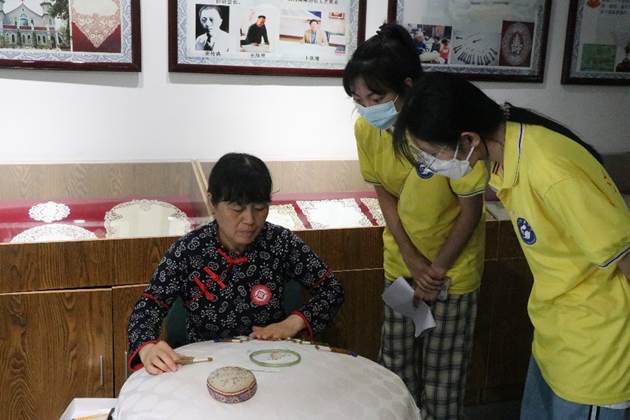 逐梦青“舟” 实践队走进青州府花边大套传习所,看到展厅内织工细腻、技艺精湛、图案美观的作品,团队成员不禁感到赞叹。编织艺人向团队成员展示平织、隔织、稀织、密织等编织手法,巧运十指,以别针为支点,将棉线扭绞、缠结,拨动棒槌,使之上下翻滚、交互穿插,绚丽多姿的花纹图案随之编织出来。在与编织艺人交流后,团队成员了解到,青州府花边大套唯美的编织刺绣令国内外客商和友人艳羡不已。早年时,其作为商品曾多次进行出口贸易,但随时间推移,花边大套的手工艺人越来越少,因其经济效益较低,对其爱好的人也越来越少,青州府花边大套应不断推陈出新,创作出具有时代感、反应区域文化的精品。