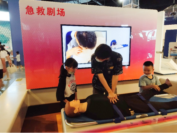 在听过诸多理论安全知识后,小朋友不禁提出:“我想学一些可以动手的知识”。心肺复苏模拟便满足了他们这个小愿望。大家一起观看过指导视频后,队员便在模拟人的身上指出了正确的按压点并为小朋友现场演示了急救动作。“每次按压的深度在5-6cm,按压的速度大概是每分钟100-120次,要比心跳的频率快很多哦”。