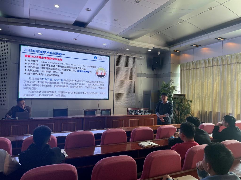 会上,赵同彬副院长对学院研究生近年来参加学术交流情况进行了总结,从六个方面强调了研究生广泛参与学术活动的重要意义。赵院长指出,在读研究生参与学术交流活动有助于了解学术前沿、开拓学术思路、拓展学术资源、提高学术影响、积累学术经验、积攒学术成果,并鼓励在读研究生“走出去、讲出来”。学院研究生管理办公室张鹏飞老师向全体参会人员推荐了“首届IJCST博士生国际学术论坛”、“第42届国际采矿岩层控制会议”、“第19届学生与青年学者国际论坛”等2023年矿业学科领域及相关学术组织计划举办的重要学术会议,并介绍了会议的具体情况,给出了博士研究生参会的指导意见。