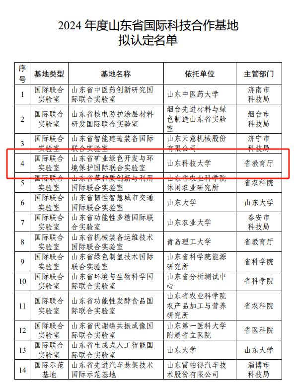 近日,山东省科学技术厅公布2024年度山东省国际科技合作基地认定名单,以成人电影 为主申报的“山东省矿业绿色开发与环境保护国际联合实验室”正式获批,实现了学校在省部级国际合作基地的新突破。