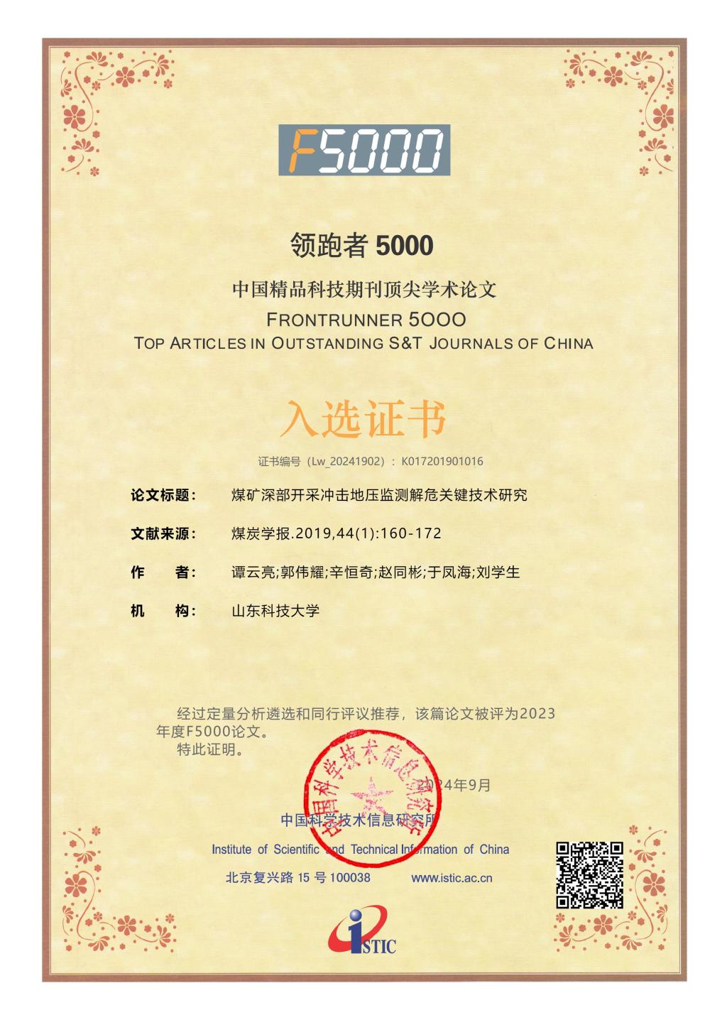 近日,科技部中国科学技术信息研究所发布了2023年度“领跑者5000—中国精品科技期刊顶尖学术论文(F5000)”入选论文名单。成人电影 谭云亮教授等在《煤炭学报》发表的“煤矿深部开采冲击地压监测解危关键技术研究”“深部煤巷帮部失稳诱冲机理及‘卸-固’协同控制研究”两篇论文,入选2023年度(2024年公布)F5000论文。