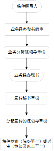 2、稿件审核流程:稿件撰写人——业务经办秘书审核——业务分管领导审核——业务经办秘书——宣传秘书审核——分管宣传的院领导审核——稿件发布(院级平台)或送审(校级及以上平台)。流程图如下: