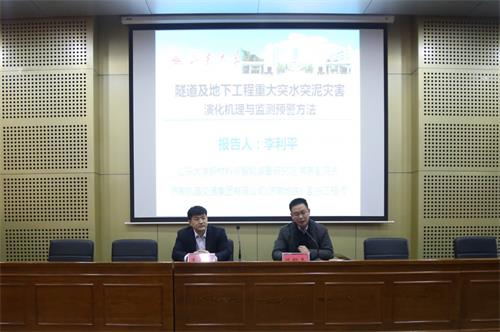 作“隧道及地下工程重大突水突泥灾害演化机理与监测预警方法”的学术报告会。会议由采矿系陈绍杰老师主持,力学系师生参加报告会。