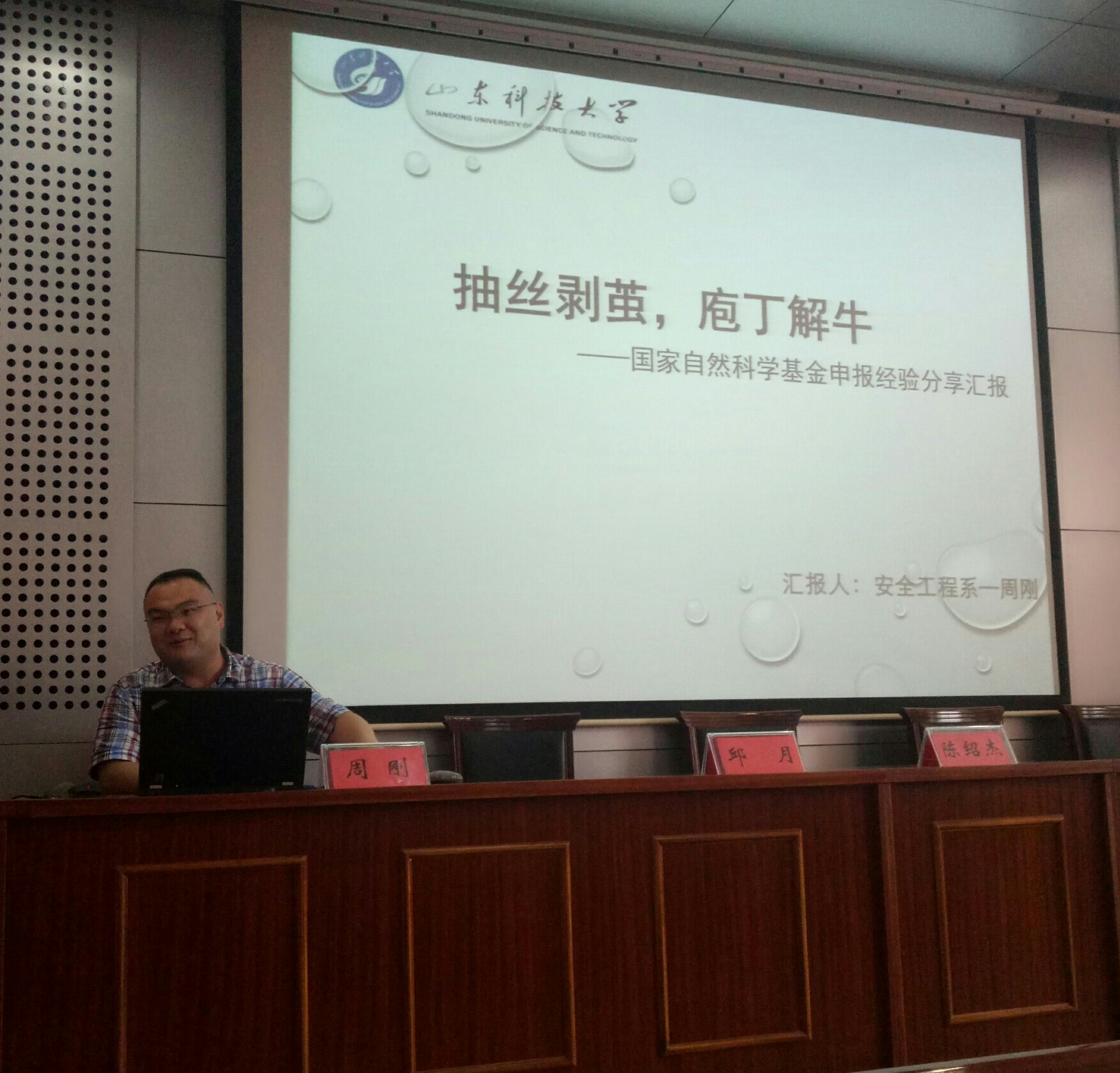 随后,青年教师周刚结合自身撰写国家基金项目经验,从国家自然基金的基本信息、申报前的准备工作、申报书的撰写等方面对国家自然科学基金申报进行了详细介绍;邱月老师围绕基金申报、立项依据、创新点等方面对山东省自然科学基金申请进行讲解;于岩斌老师从自身两次申请山东省基金的历程出发,着重强调基金申请之路的自我修行和行囊必备,使参会师生对科研项目撰写和申请有了更加深入、具体的认识。