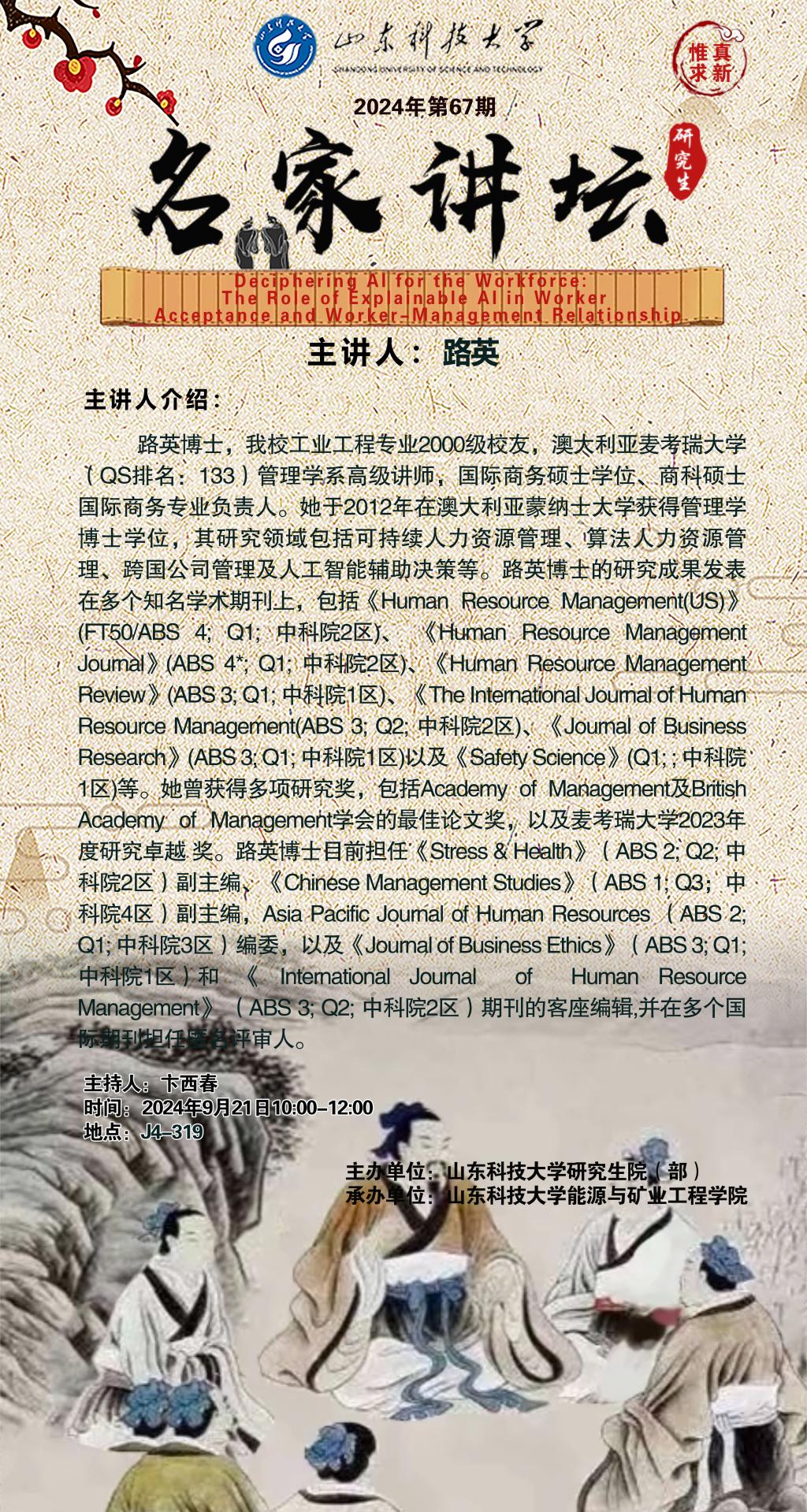 “名家讲坛”2024年第67期:Deciphering AI for the Workforce:The Role of Explainable AI in Worker Acceptance and Worker-Managenment Relationship.