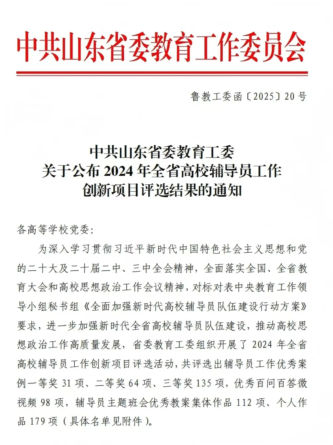 据悉,全省辅导员工作创新项目评选工作由中共山东省委教育工委举办,本次评选在各高校选拔推荐的基础上,经专家评审、网上公示等环节,共评选出辅导员工作优秀案例230项(一等奖31项,二等奖64项,三等奖135项)。