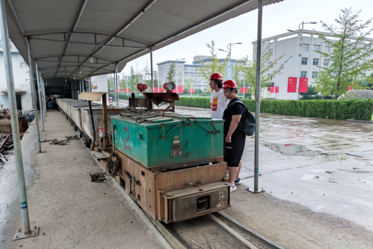 在了解了注意事项后,队员们离开了办公区,正式开启了一天的实践学习。刚进入生产区,首先映入眼帘的是一座高大的建筑,据工作人员介绍,这是一口矿井,莱新铁矿共三口井,一口主井,两口副井,眼前的便是副井之一,工作人员同时讲解道:“矿井是矿业生产系统的井巷、硐室、装备、地面建筑物和构筑物的总称。”走近副井,队员们见到了入井口,以及矿车。工作人员介绍:“矿车是矿山轨道运输的专用车辆,眼前的是用于运输矿石和物料的固定车箱式矿车。”