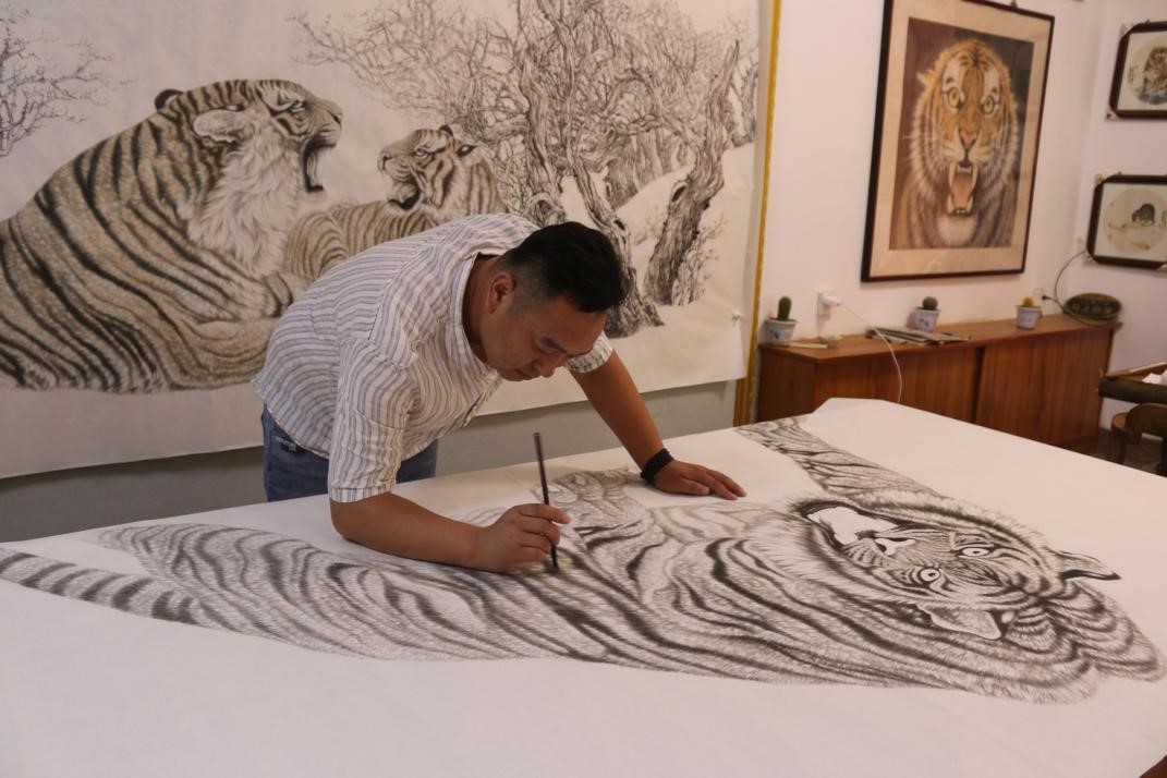 队员们观赏村长画虎过程