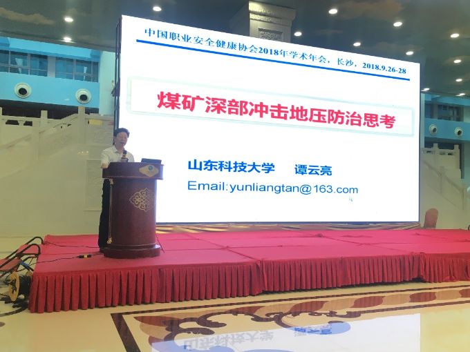 谭云亮教授受邀在会议上做“煤矿深部冲击地压防治思考”主题发言。他从深部冲击地压防治迫切需要解决的关键问题出发,在深部冲击地压能量积聚、危险评价、监测预警、卸压解危等四个方面进行了深入阐述,并指出了今后深部冲击地压防治的发展方向。报告在会议引起强烈反响,并得到中国职业安全健康协会副理事长马骏等专家的一致好评。