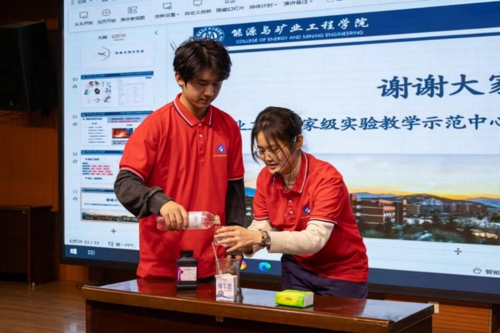 随后的实验环节中,宣讲队成员辛友成、赵若溪为同学们展示了精心筹备的两个实验项目——牛奶与高锰酸钾氧化变色实验以及连通器实验,并邀请同学们近距离观察实验现象。同学们踊跃参与,在亲身体验中感受科学魅力的同时,也在各位同学的心中埋下了被科学润泽的充满探索与好奇的种子。实验结束后,辛友成给同学们展示和介绍3D打印的煤矿巷道模型,进一步激发了他们对科学的热爱与探索精神。